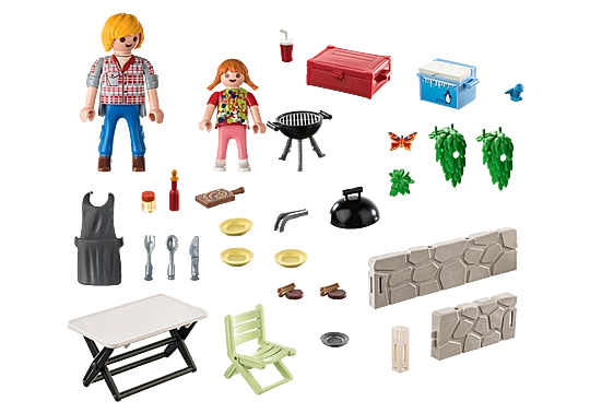 Figures: 1 man, 1 child; Animals: 1 bird, 1 butterfly; Accessories: 1 tongs, 1 apron, 1 grill, 1 sausage, 2 chairs , 1 table, 1 bottle with cork, 3 plates, 3 sets of cutlery, 1 freezer, 1 box, 1 beverage cup, 1 glass, 1 wall, 2 greens