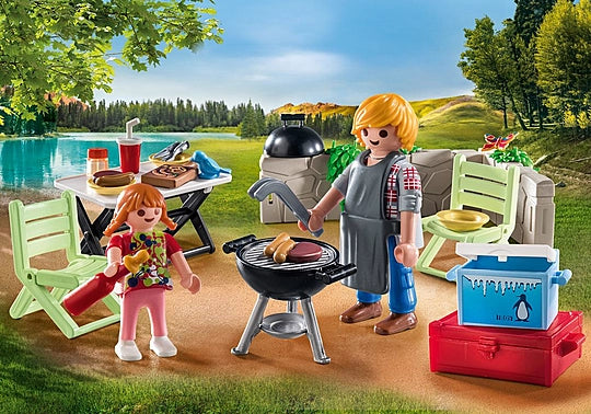 Barbecuing together is simply part of camping. The food tastes twice as good in the fresh air. After an eventful day, everyone gathers around the grill and waits in anticipation until the treats are ready. This charming PLAYMOBIL playset contains everything for cozy barbecue evenings: Table, chairs, crockery and cutlery, a cooler and of course a grill. With the detailed playsets of the PLAYMOBIL Family Fun series, camping fans aged 4 and up can immerse themselves in countless varied role-playing adventures.