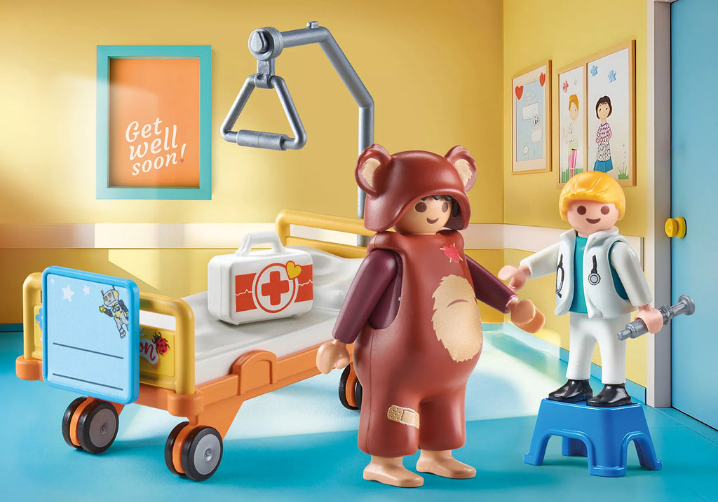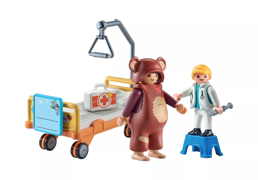 Accessories: 1 bear costume with hood, 1 hospital bed with customizable patient board, stool, 1 doctor’s kit with equipment, 1 sticker sheet with various plasters and bandages