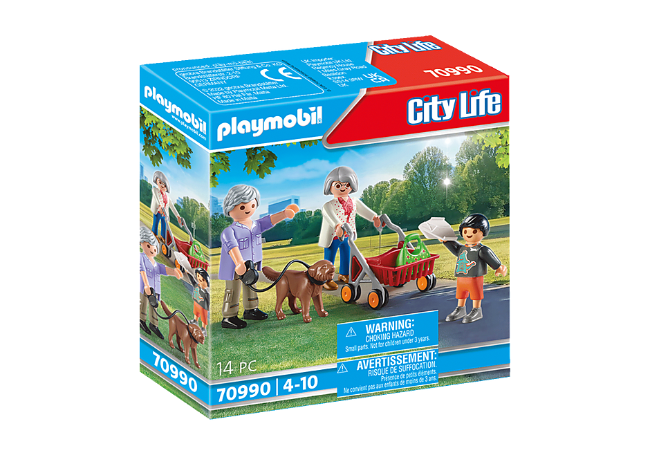 The grandparents love to go for walks. Every day they are outside and enjoy the time in the fresh air. Today their grandson is visiting and is already looking forward to the walk through the park, because he really wants to test his new paper aeroplane. He quickly runs in front and does his first throwing exercises. With her walker, Grandma prefers to take it easy. The set includes two grandparents and a child figure, a dog, a paper aeroplane, a walker and other extras.