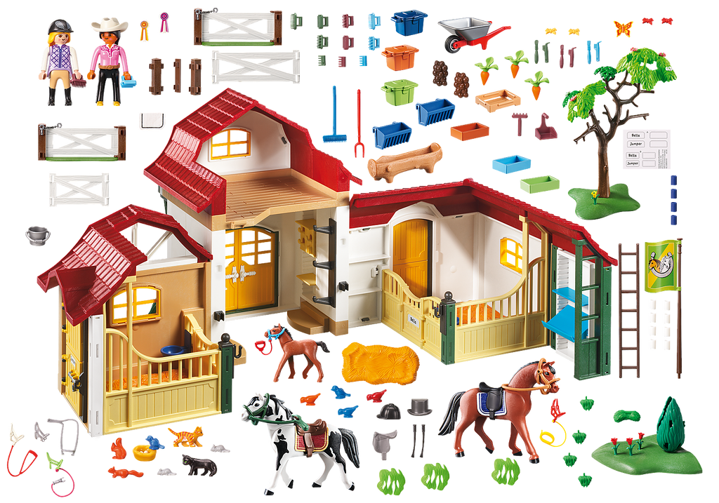 Figures: 1 western rider, 1 female rider; Animals: 2 horses, 1 pony with halter, 2 cats, 1 squirrel, 5 birds, 2 mice, 1 butterfly; Accessories: 1 large riding stable, 1 tree, 1 meadow with shrub, 10 gates, 2 gates, 5 posts, 1 corner post, 5 post adapters, 2 feeding troughs, 1 drinking trough, 1 ladder, 1 wheelbarrow, 1 broom, 1 pitchfork, 1 flag on the flagpole, 1 wooden box, 3 boxes with lid, 3 boxes without lid, 1 saddle, 1 saddle cloth, 1 riding helmet, 3 horses; accessories for cleaning, 1 foal halter, 4 halter, 1 rein, 2 crops, 1 top hat, 1 hay bundle, 1 bucket, 4 plant clips, 3 green fodder, 2 tournament bows, 12 bandages, 1 rake and shovel, 1 bird's nest with eggs, 2 horse dung, 3 turnips