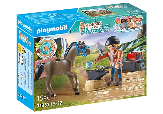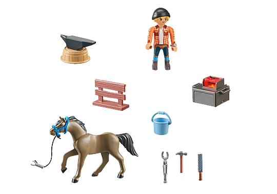 • Richly detailed horse toy set with PLAYMOBIL farrier Ben, horse Achilles, anvil, tongs, hammer and forge and many other extras for shoeing the horses