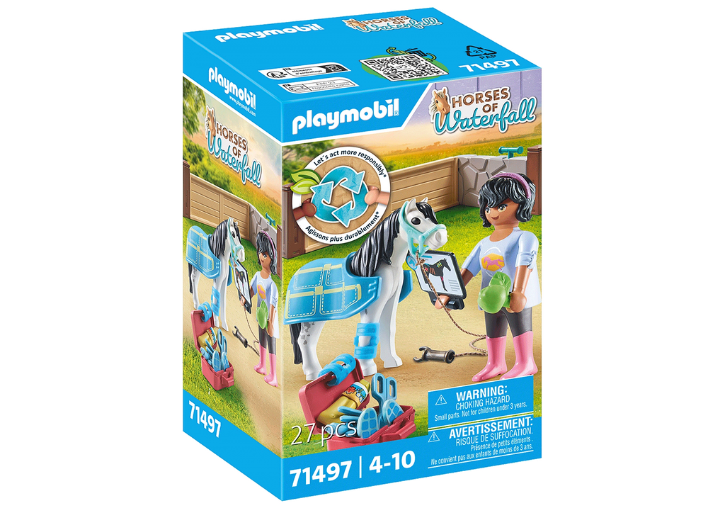 Figures: 1 woman; Animals: 1 pony; Accessories: 1 horse blanket, 2 bandages, 1 halter, 1 rope, 1 apple, 1 suitcase with accessories, 1 clipboard