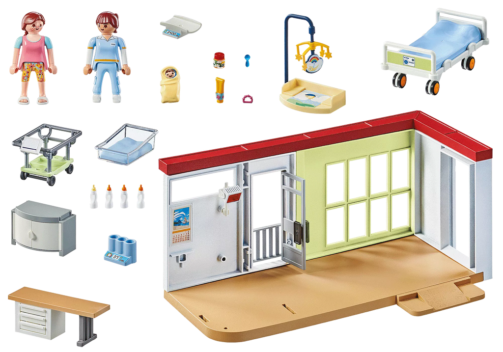 A playful start into life with the friendly PLAYMOBIL Maternity Ward featuring three PLAYMOBIL figures, changing table, warming lamp, and many realistic accessories.