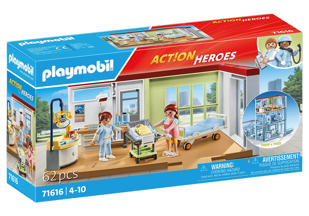 Welcome to life! In the postnatal ward, the well-being of mother and child is well taken care of. The name of the youngest family member can be written on the sign on the baby's bed, and a scale is available to check the baby's weight. Complete with a changing table, warming lamp, baby milk bottles, and many other accessories. The PLAYMOBIL Maternity Ward can be modularly attached to the Modern Hospital (71615). PLAYMOBIL's Action Heroes Hospital World invites children to learn about modern hospital life and engage playfully with topics such as care, treatment, and illness. The 62-piece toy set includes 3 PLAYMOBIL figures, a building wing, a hospital bed, a changing table, and many other extras for imaginative role-playing.