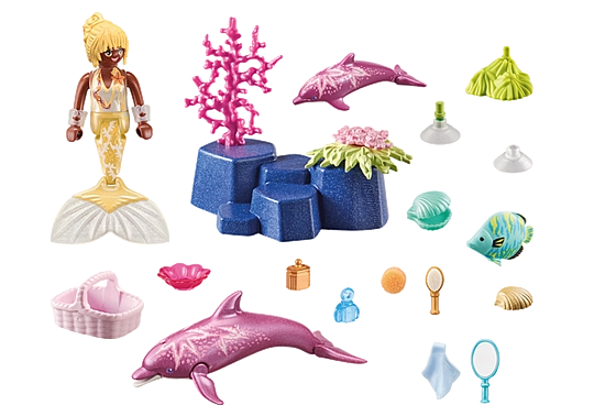 Embark with the mermaid into the endless depths of the shimmering PLAYMOBIL underwater world. Tending to marine life is one of the vital tasks of the underwater community. The mermaid lovingly cares for the dolphin mother and her offspring. With imaginatively designed figures, animals, and fantastic accessories, the PLAYMOBIL Princess Magic Underwater World invites children into a magical play universe. The PLAYMOBIL set includes a mermaid, a dolphin with a baby, a rock with coral, and many other exciting extras for thrilling role-playing. An ideal gift or souvenir for children aged 4 and up.