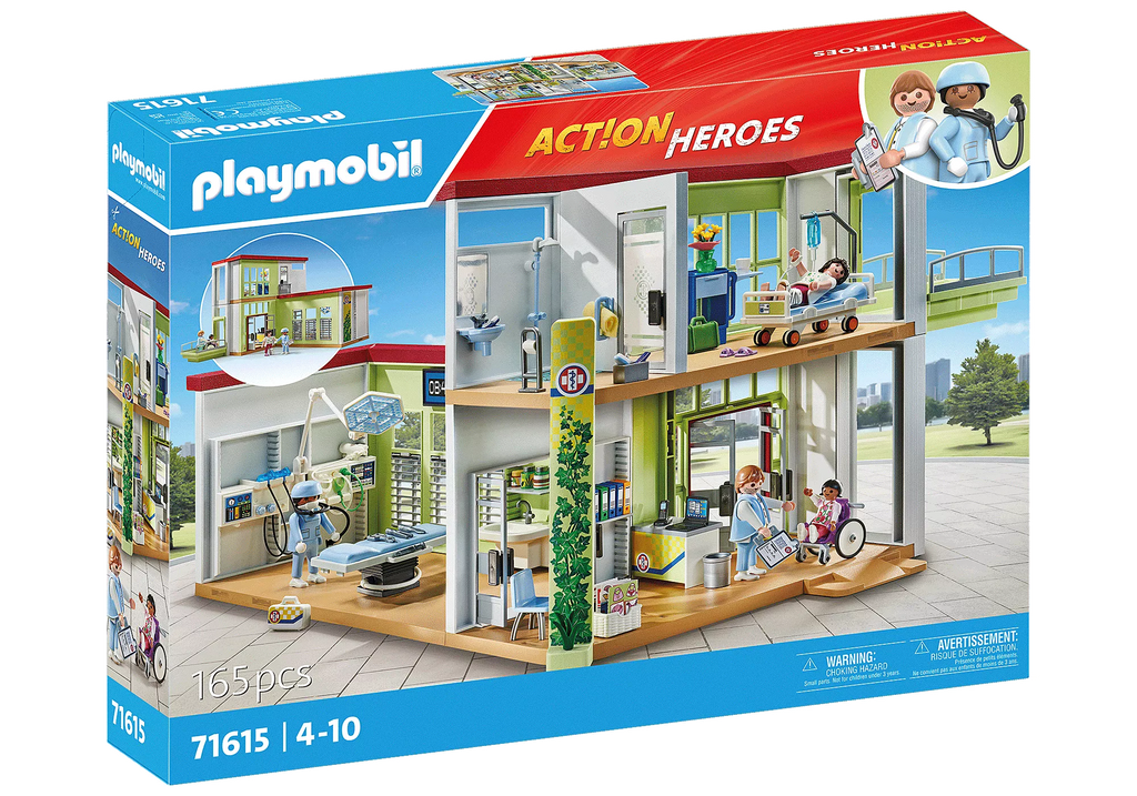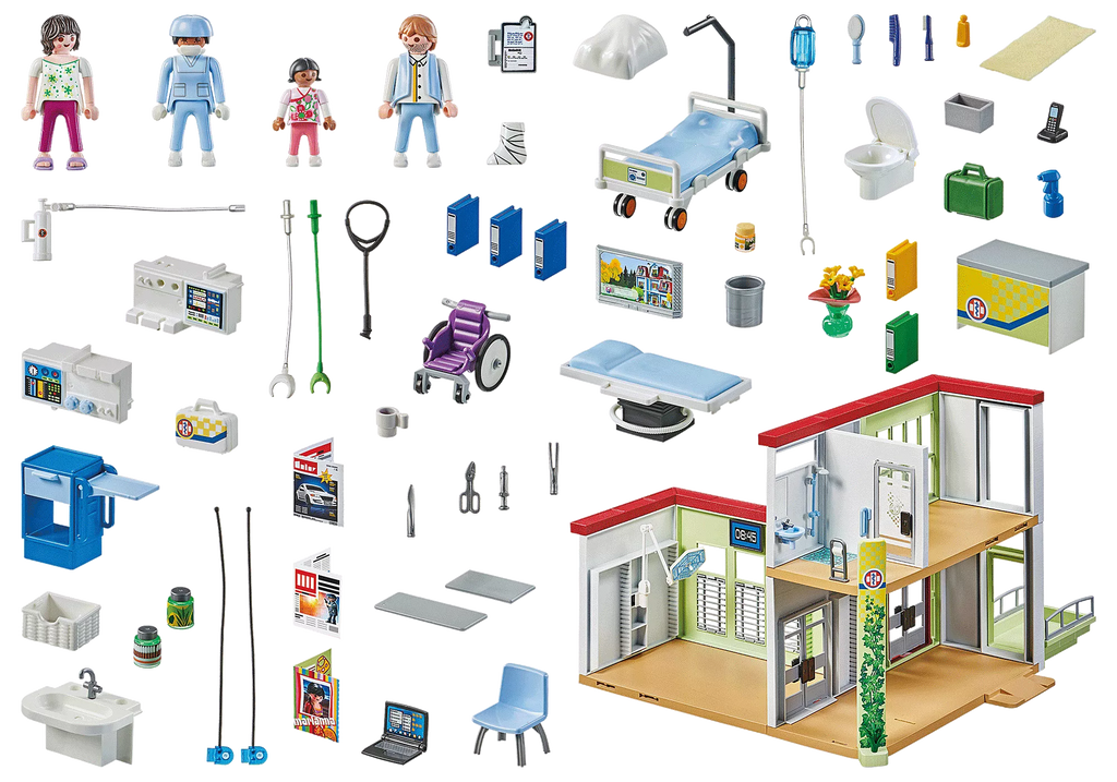 Getting healthy is easy at the modern PLAYMOBIL Hospital. Detailed hospital playset featuring four PLAYMOBIL figures, operating room, hospital ward, elevator, and plenty of accessories.