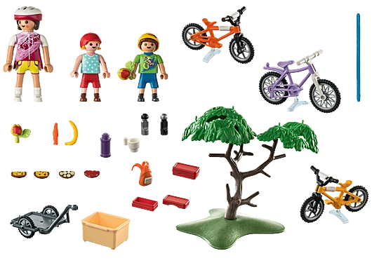 Figures: 1 woman, 2 children; Accessories: 1 tree, 2 children's bikes, 1 bike, 1 bottle, 1 backpack, 3 helmets, 1 trailer, 1 rubber, 1 apple, 1 water bottle