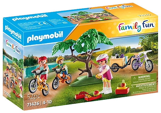 Hop in the saddle and set off on an exciting mountain bike tour with the whole PLAYMOBIL family. The detailed PLAYMOBIL playset contains everything for extended bike tours in the children's room: three bikes, helmets, a backpack, provisions and other great accessories. For safety, everyone always puts on their helmets. The extra equipment can be stowed in the bike trailer and secured with the silicone belt. PLAYMOBIL camping playsets invite children aged 4 and up to relive their best vacation experiences at home. Great playing fun on your own or with friends. Combine the mountain bike tour with other sets from the Family Fun series for even more play fun.