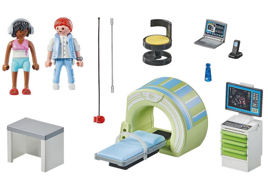 Figures: 1 woman, 1 man; Accessories: 1 MRI machine, 1 PC, 1 laptop, 1 table, 1 telephone, 1 chair