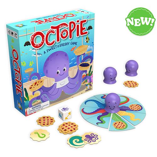 It’s an undersea race to gather eight matching arms for your octopus! Roll the die to see if you will draw from the octo-pile, flip over a tile to reveal the color lying beneath, or even swap with an opponent. Find an arm holding a pie, and you get a tasty extra action to help win the race. Be the first to complete your octopus and win first pies!