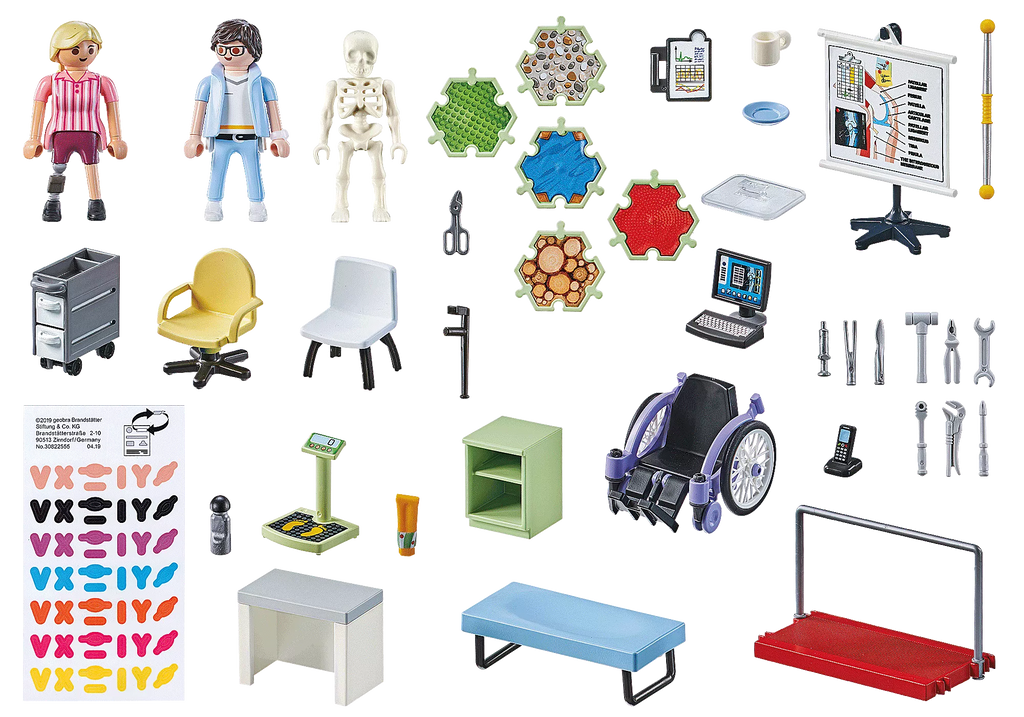 The 69-piece toy set includes everything children need to immerse themselves in the exciting world of orthopedics: treatment bed, scale, various walking aids, tools, as well as two PLAYMOBIL figures, a wheelchair, and plenty of other medical accessories. The three-part prosthesis can be attached and removed from the female figure.