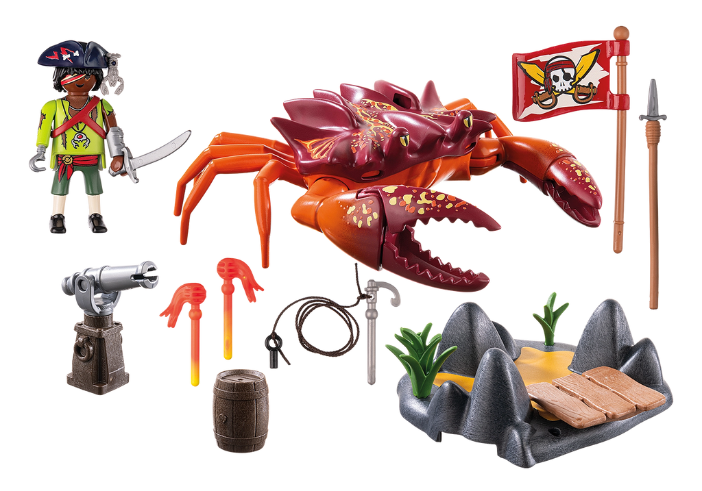 Dive into the battle against the Giant Crab with this fantastic PLAYMOBIL set. The pirate faces the enormous crab armed with his grappling hook cannon. However, the crab quickly grabs the buccaneer with its mighty claw and tosses him into the sea. The pirate had a different outcome in mind. With imaginative characters, fantastic features, and creepy monsters, the Pirates play world from PLAYMOBIL invites exciting role-playing adventures. An ideal gift or souvenir for pirate fans aged 4 and up.