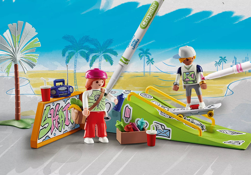 Figures: 1x man with cap, 1x woman with cap and shoulder bag; Accessories: 1x ramp with platform section and wall element, 1x palm tree with base plate, 1x boom box, 1x crate, 5x paint spray cans, 1x skateboard, 2x drinks with straw, 4x thin Crayola pens, 1x sponge, 1x paintable and washable sticker sheet