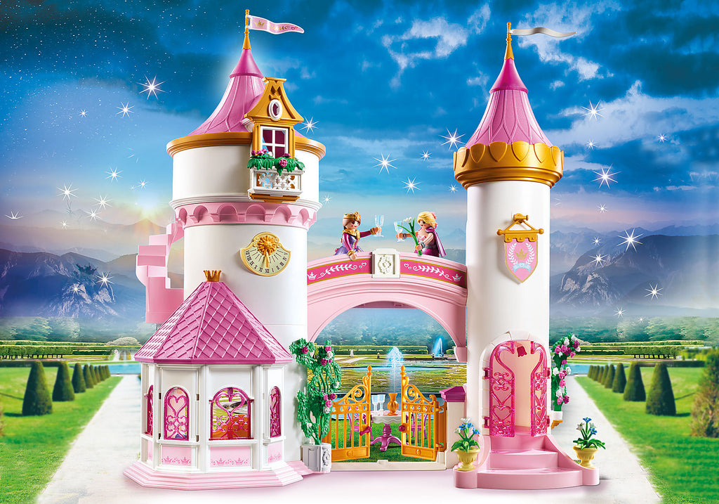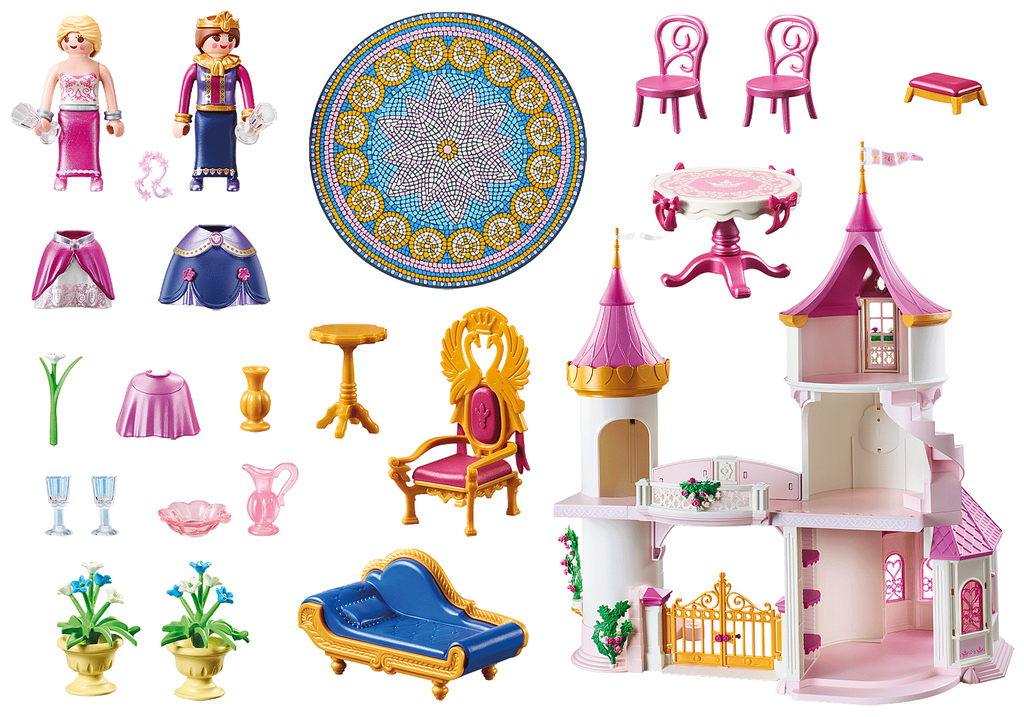 Figures: 1 Queen, 1 Princess Accessories: 1 princess lock with rotating dance plate, 1 carpet, 1 side table, 1 table with bows, 2 chairs, 1 bowl, 1 carafe, 4 glasses, 1 throne, 1 footstool, 1 ottoman, 1 crown, 4 bracelets, 1 cape, 1 hair ornament, 1 hoop skirt with flowers, 1 hoop skirt with belt, 1 vase with flower
