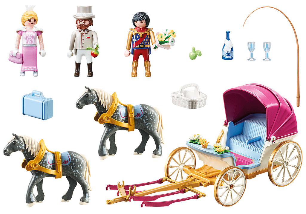 figures: 1 princess, 1 prince, 1 coachman Animals: 2 horses Accessories: 1 horse-drawn carriage with folding roof and floral decoration, 1 whip, 2 saddlecloths, 2 collars, 4 sluices, 1 drawbar, 1 cylinder with bow, 1 crown, 1 collar, 1 picnic basket, 1 bouquet of flowers with floral paper, 1 clutch, 1 suitcase, 2 apples, 1 bottle of sparkling wine with cloth, 2 champagne glasses