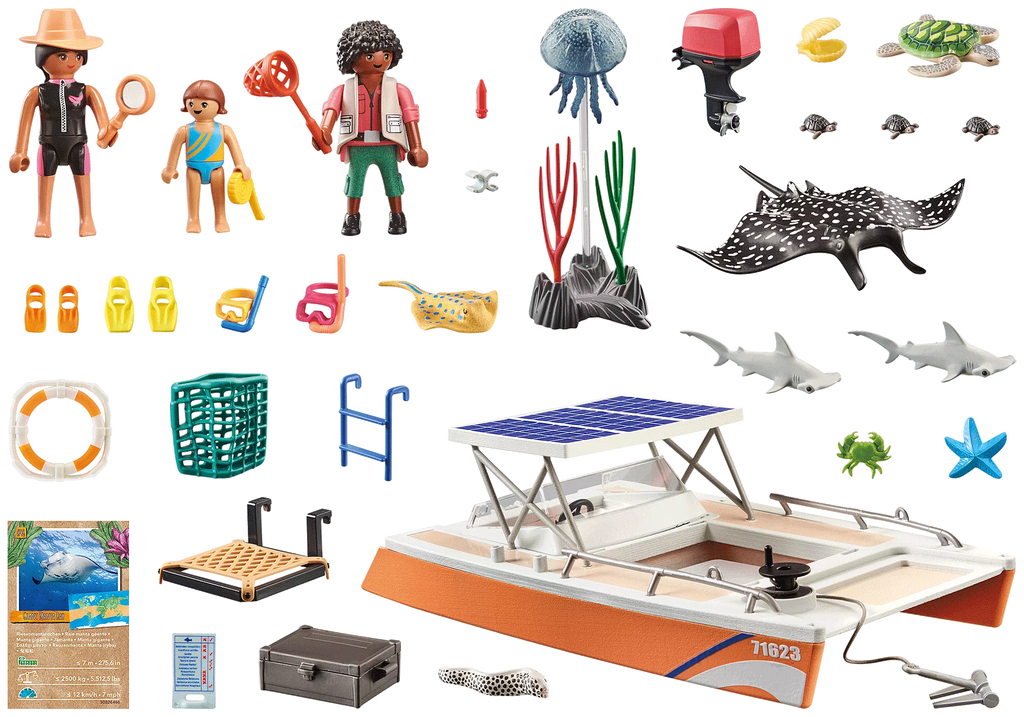 Figures: 1x woman with diving equipment (Lu Palmer), 1x girl with diving equipment (Sofie), 1x man (Australian captain) Animals: 1x jellyfish (swimming, attached to stick), 1x manta ray, 1x stingray, 2x hammerhead shark babies, 1x starfish, 1x crab, 1x sea turtle, 3x turtle babies, 1x moray eel Accessories: 1x catamaran with solar roof and central transparent glass floor with magnifying glass function, 1x anchor, 1x external ladder, 1x boom with net, 1x stern motor, 1x case with various utensils