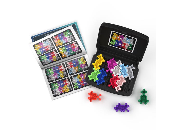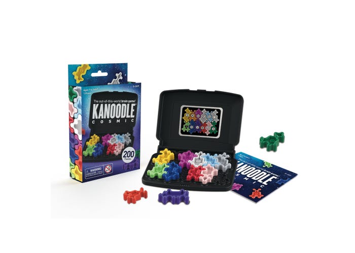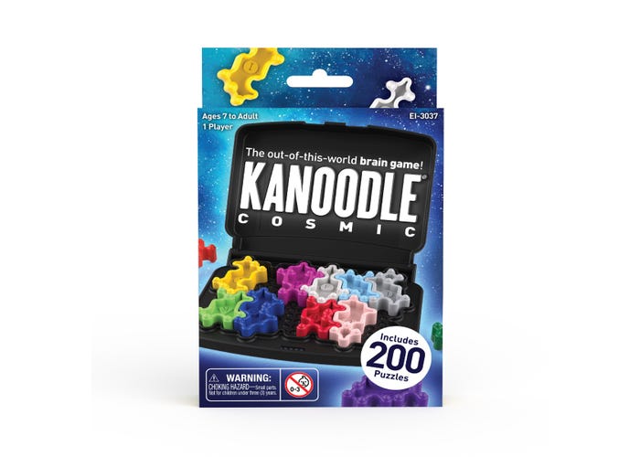 Critical thinking goes cosmic with this galactic game of strategy and reasoning. Choose a challenge from the puzzle book, place the pieces shown...then fill the empty spaces with the remaining pieces—including six asymmetrical shapes that fit four different ways! There are hundreds of possible combinations, but only one completes the puzzle. Puzzle pieces fit inside the handy pocket-sized case, so you can Kanoodle anywhere. Includes puzzle board, 12 shaped puzzle pieces, puzzle book with 200 challenges, and carrying case.
