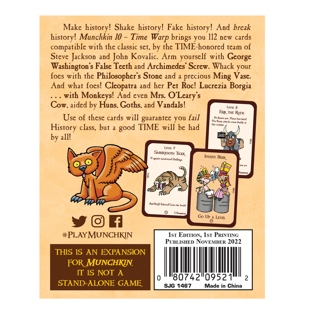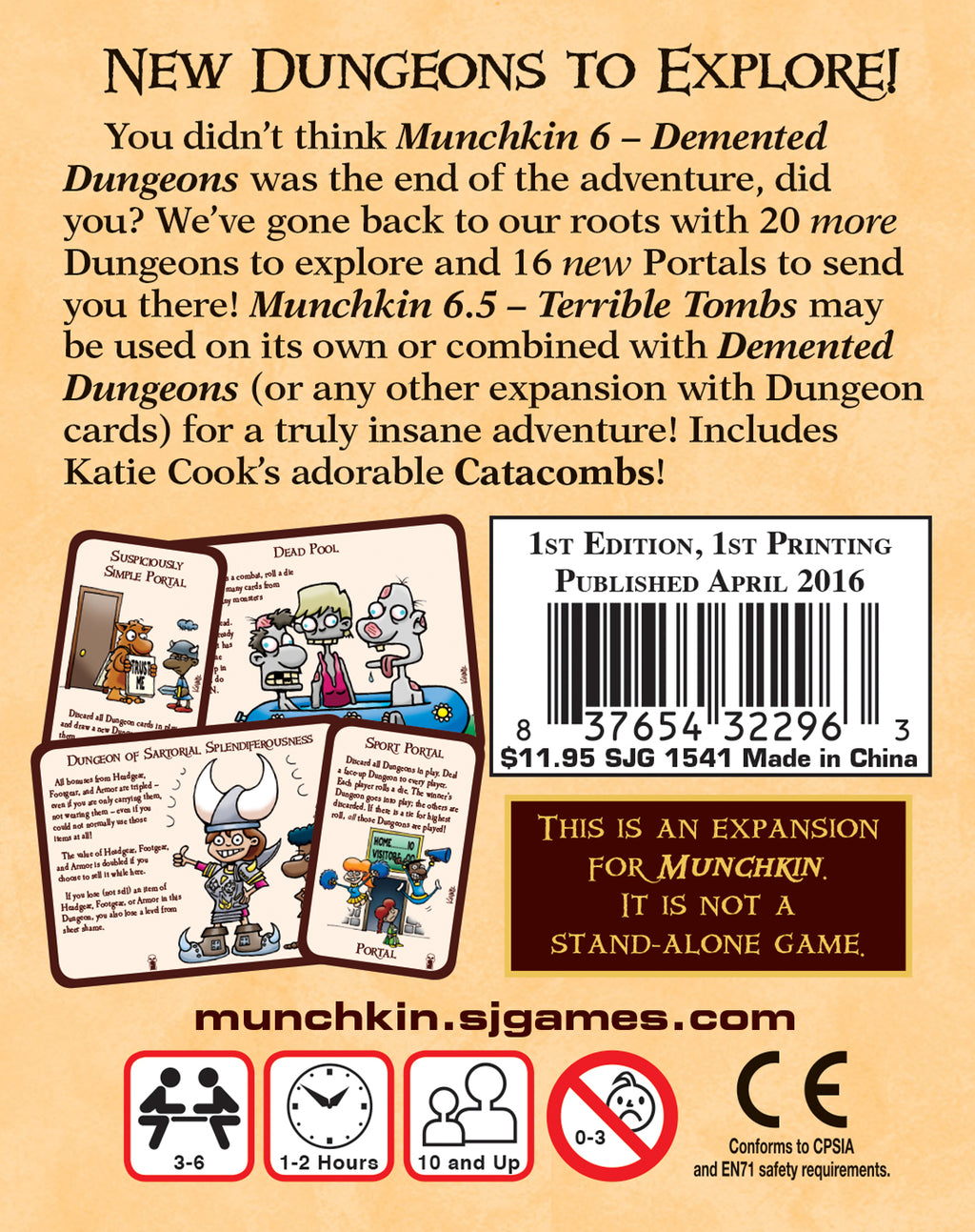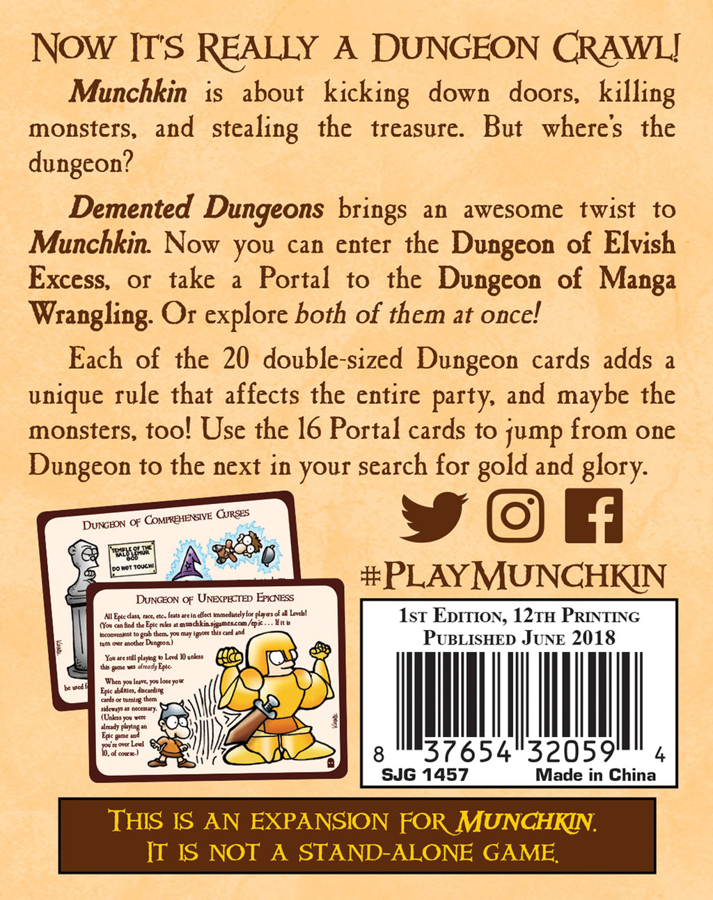 Munchkin is the mega-hit card game about dungeon adventure . . . with none of that stupid roleplaying stuff. You and your friends compete to kill monsters and grab magic items. And what magic items! Don the Horny Helmet and the Boots of Butt-Kicking. Wield the Staff of Napalm . . . or maybe the Chainsaw of Bloody Dismemberment. Start by slaughtering the Potted Plant and the Drooling Slime, and work your way up to the Plutonium Dragon . . .